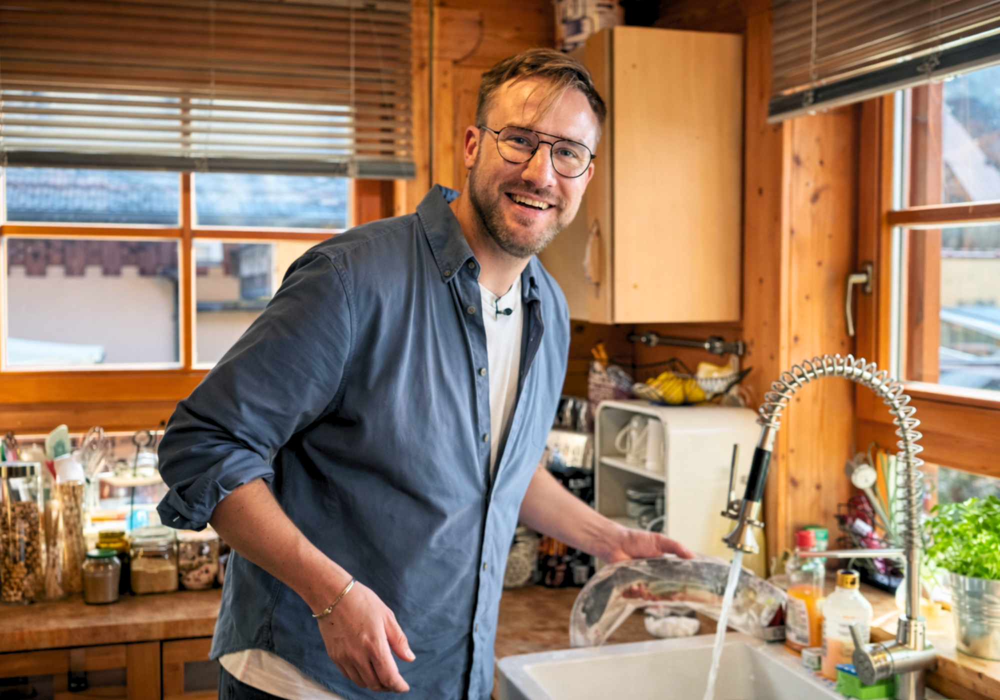 In „Hausnummer Lecker“ kocht er spontan in fremden Küchen – nur mit dem, was der Kühlschrank hergibt.
